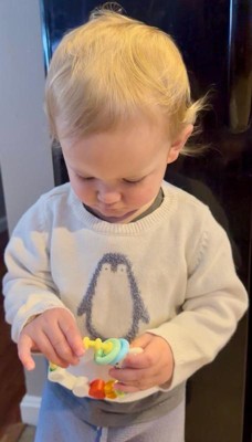 [This review was collected as part of a promotion.] Such a cute and colorful toy. It’s made of a softer silicone and has ridges that are perfect for a teething baby. It makes a slight sound when bay shakes it