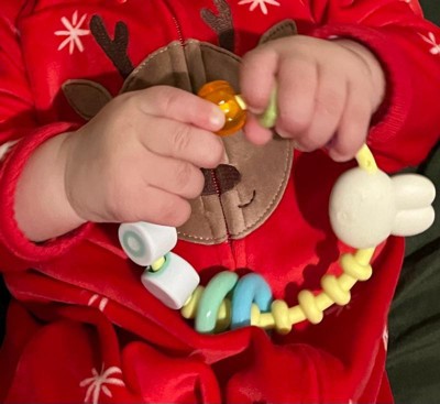 [This review was collected as part of a promotion.] The Infantino Baby Friendship Rattler is a cute, lightweight toy that’s easy for little hands to hold. It makes gentle rattling sounds and helps keep babies engaged while supporting sensory play. It also has a chewable on it to help there sore gums.