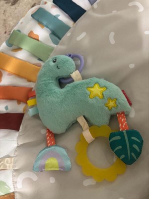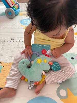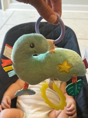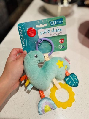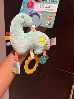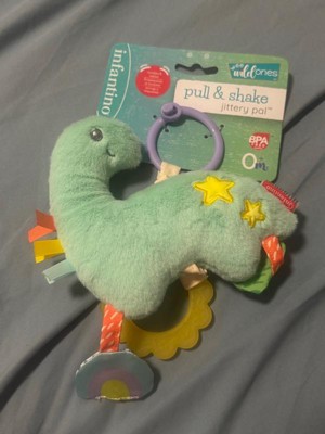 [This review was collected as part of a promotion.] This adorable plush toy is perfect for little hands! Soft, colorful, and full of sensory fun, the “Pull & Shake” Jittery Pal by Infantino keeps babies engaged with gentle vibrations and crinkly textures. The bright colors and tags stimulate visual and tactile development, while the BPA-free teether adds soothing relief. Great for attaching to strollers, car seats, or diaper bags. A must-have for on-the-go play! 🦕🌈⭐️
