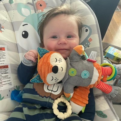 My 2.5 month old loves looking and pulling on this fox! We hooked this on his play mat bc he was not interested in what the play mat came with. The crinkle gets his attention and the rings are great for him to grasp and pull. Great find!