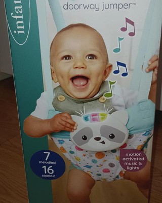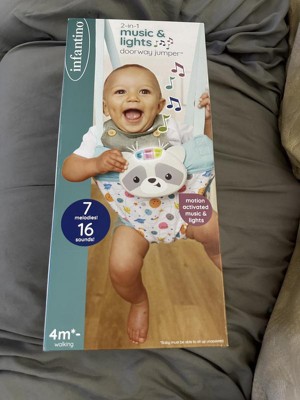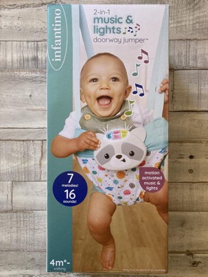 [This review was collected as part of a promotion.] The Infantino 2-in-1 Music & Lights Doorway Jumper - Raccoon is a lot of fun! Love the motion activated music and lights to keep little ones entertained. Very convenient to take-along the raccoon toy for push and play fun. Nice to have seven melodies and sixteen sound effects for excitement!