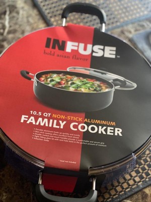 [This review was collected as part of a promotion.] First of all, this pot is massive. They did say it was 10.5 quarts but I didn’t expect it to be so wide. This makes it perfect for making large batches of food but if you don’t need to make that much then this might not be for you. One point of improvement would be to make the infuse pot out of something better than aluminum. Other than that, I was happy with the heat distribution and that the handles made it easy to carry such a large amount of food.