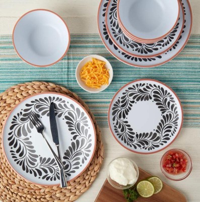 [This review was collected as part of a promotion.] This dinnerware is a hard plastic (melamine) but looks like China. It is so beautiful and completely durable. I am so happy with the print/pattern - just gorgeous. The only reason I knocked off a star is because although this set is “dishwasher safe,” it is only meant to be placed on the upper rack. I don’t know about you but placing dinner plates on the upper rack takes up way too much real estate. Also, one of the bowls came out of the dishwasher with a blue stain. I can only think this is from the dishwasher pod as we didn’t eat anything blue - it was as if the orange rim got scratched off and blue is underneath. Not a dealbreaker by any means. I have been handwashing dinner plates and placing the rest in dishwasher. Even pasta sauce and tomato based soups come out clean so unsure about that blue stain. Overall I definitely recommend. These can even be used outdoors.