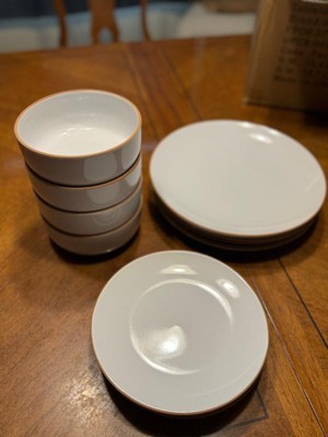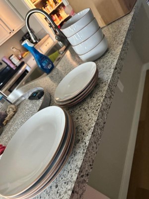 [This review was collected as part of a promotion.] I love the way these plates look. The color scheme and the shapes of the plate make bowls. The one downside is that the edges of the plates and bowls have this brown lining that easily chips. So when handwashing or storing the plates it can easily chips
