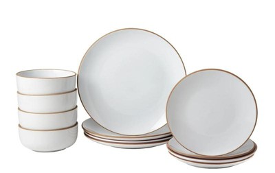 These high-quality stoneware dinnerware bowls and plates are well suited for everyday use, with scratch-resistant qualities and a space-saving stackable design. The beautiful gloss is nonporous and non-reactive, ensuring your meals slide off the surface effortlessly with less time spent cleaning stubborn food residues and tedious scrubbing sessions. This dinnerware collection is 100% dishwasher-safe and microwaveable. This 12-piece set includes four place sets of dinner plates, salad plates, and cereal bowls.