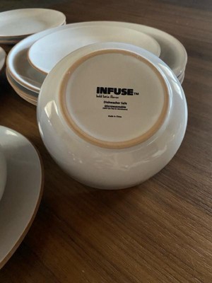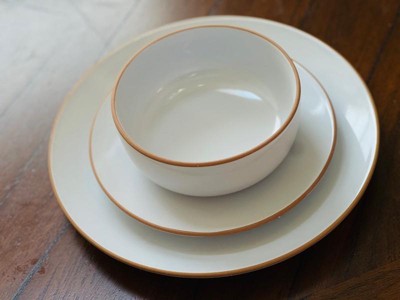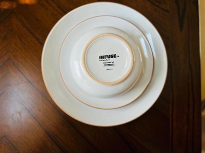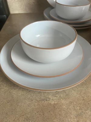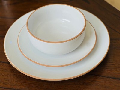 - Crisp, classic white stoneware featuring a warm and earthy faux terracotta rim creates a striking contrast that enhances any table setting and food presentation