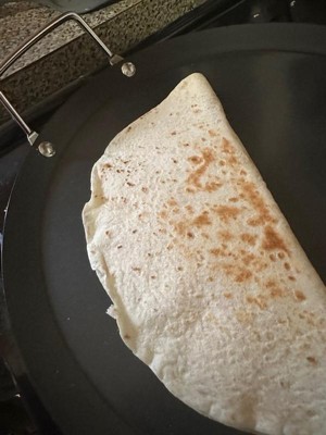[This review was collected as part of a promotion.] Perfect size to heat up tortillas, roti, or any other pancake like bread! The pan has a decent weight to it. It heats evenly. Truly non-stick, hardly need any fat to keep from sticking which makes it easy to clean. One thing I would say is the handle does get hot after a while.