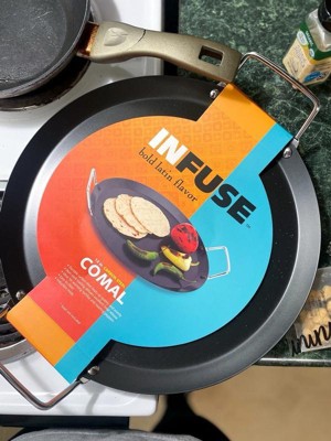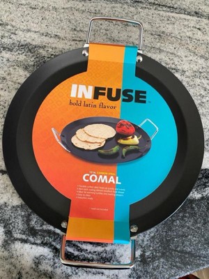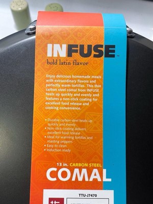 INFUSE brings the intense flavors of Latin cuisine to your kitchen with a cookware collection that celebrates the cultural significance of Latin cooking. Our assortment is designed to honor the rich history of the cuisine and bring out the delightful aromas and delicious flavors that have made the food so popular worldwide. Enjoy delicious homemade meals with extraordinary flavors and perfectly warm tortillas. This thin carbon steel comal from INFUSE heats up quickly and evenly and features a non-stick coating for excellent food release and cooking convenience.