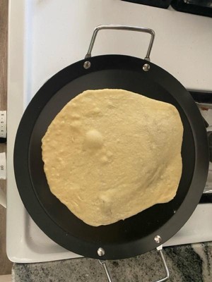 [This review was collected as part of a promotion.] Perfect size to heat up tortillas, roti, or any other pancake like bread! The pan has a decent weight to it. It heats evenly. Truly non-stick, hardly need any fat to keep from sticking which makes it easy to clean. One thing I would say is the handle does get hot after a while.