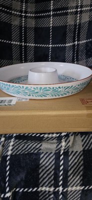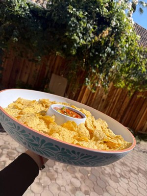 [This review was collected as part of a promotion.] This was free in exchange for an honest review. I absolutely love this serving tray! The design is even prettier in person — the teal leaf pattern around the edge adds such a nice pop of color and gives it a modern yet charming feel. The built-in center dip bowl is super convenient for things like ranch, salsa, or hummus. I used it for veggies and dip at a small get-together and got so many compliments! It feels sturdy and well-made, not flimsy at all. The size is perfect for snacks, chips and dip, or even a taco night setup with different toppings. It also came securely packaged with no damage, which I really appreciated. Highly recommend this for anyone who likes to entertain or just wants to upgrade their snack game with a cute, functional piece!