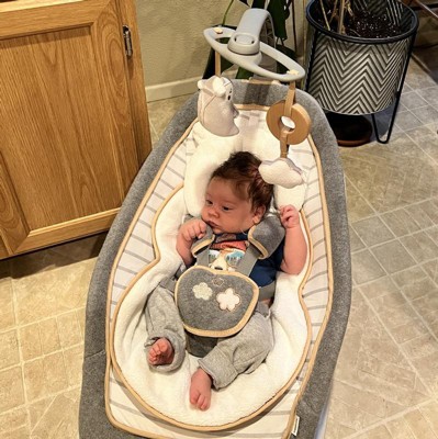 Designed with parenthood in mind. This is as chic and modern as a baby seat gets! This contemporary rocker has a one-of-a-kind recline option with three very distinct positions to keep baby comfortable. This seat rocks but also converts to a stationary seat with calming vibrations, nature sounds and music. The toy bar removes so it becomes a handy rocking seat as your baby grows. Possibly the best part of this amazing baby seat from Ingenuity is its great looks and premium, posh fabrics. Remarkably soft fabrics pamper baby in luxurious softness with an added bolster and character head rest that offer extra support for smaller babies and can be removed as baby grows. Even the safety harness is wrapped in soft, fleecy fabrics to protect baby's sensitive skin. This modern platform is designed to fold almost completely flat so storage and transport are easy. You'll love how it looks in your home and baby will love being snuggled in softness.