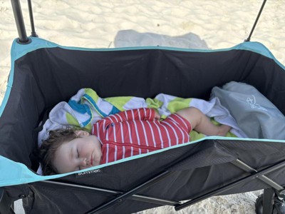 This is actually the best! I let my baby play in here while I work outside or coach soccer practice. It's so easy to fold up and take off or put on the canopy. We just took it to the beach, and I 10/10 recommend. It rolled on the sand as well as any other wagon does and was perfect for carrying the baby and so much beach stuff. Good storage pockets on the side as well as a cup holder you can remove. It can be pulled from the handle or pushed from the handlebar on the back. It has two sets of seat straps to keep kiddos safe while riding, and when it was nap time, we laid a towel down inside for him to sleep at the beach while shaded! My baby has also taste-tested this and confirmed it is good to chew on.