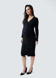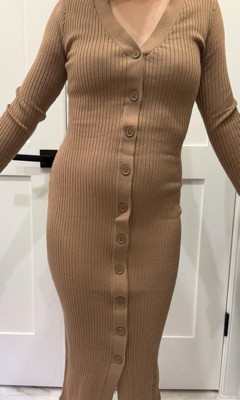 A: The dress features a relaxed silhouette with long sleeves and a front button-down design.
