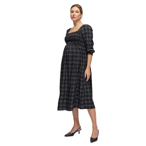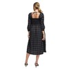 A: The dress features a smocked bodice, square neckline, and midi-length skirt.