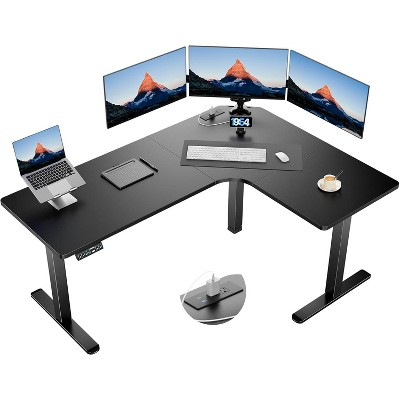 Shaped Electric Standing Desk, 63 x 47.2 inches. A height - adjustable corner desk with power outlets and 2 memory buttons.
