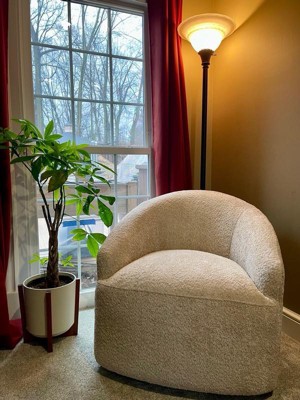 Add a comfortable and casual flair to your home with this INK+IVY Bonn swivel chair. This barrel-style chair is upholstered in a soft textured boucle fabric and has a tight attached seat to create a modern minimalist look. The sloped arms provide additional comfort to make this motion chair stylish and cozy.