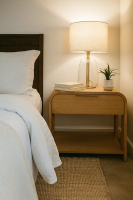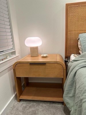 Elevate your bedroom with this Mid-Century Modern Jameson Nightstand from Ink+Ivy. Flaunting clean lines, a curved silhouette, and rounded corners, this nightstand merges style with function. Its caramel maple finish on solid wood veneer accentuates the wood's organic grain. Store essentials in the smooth-gliding drawer, which extends to 2/3 for stability, or use the open shelving for easy access. A sleek antique bronze handle beautifully contrasts the nightstand's contemporary waterfall shape.