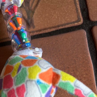 My babies love this toy. However, I don’t find the quality to be great. We have had it less than 2 months and it has started to fall apart. The fabric around the bottom of the neck split open to reveal a zip tie with sharp ends holding it together. I can now tell that the head is held on in the same fashion. This is dangerous for a baby toy.