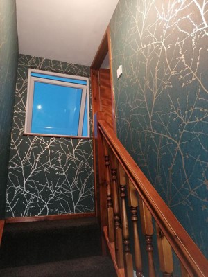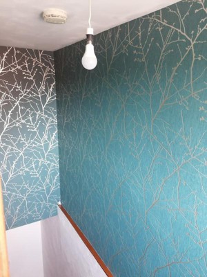 We chose this paper to finish off the top of the attic stairs. It looks stunning from the landing below! Very elegant yet contemporary. The top of the house looks like a plush hotel now!