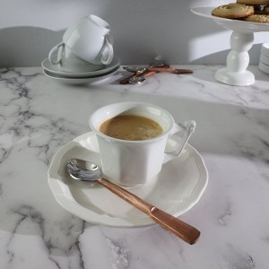 Give your coffee bar a fresh look with the Celia Coffee/Demitasse Spoon 4 Pc. Set. Textured handles in an antique copper finish offset these mirror-polished stainless steel spoons. Smaller demitasse spoons are perfect for specialty cups and for spooning cappuccino froth.