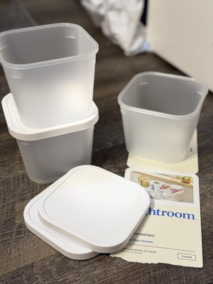 [This review was collected as part of a promotion.] These are compatible with a full storage system, but I just got them to use as containers for toiletries and small items. They are perfect for small items, but not so small that they aren't helpful. I have some extra lotions, lip products, and essential oils stored in mine. I like that they stack and also are fairly square shaped so you don't lose a lot of space. They are a good level of opaqueness, you can still see what's in them, but it does look more tidy they if they were clearer. I received an incentive to write this review.