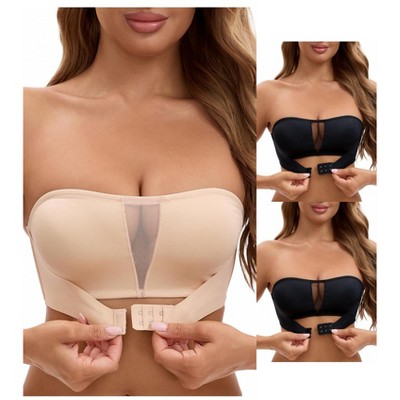 INSPIRE CHIC 3 Packs Women's Mesh Front Closure Push Up Wirefree Bandeau Strapless Breathable Tube Bras 3 Beige Large