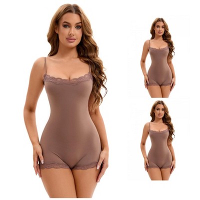 INSPIRE CHIC 3 Packs Women's V-Neck Tummy Control Bodysuit Sleeveless Floral Lace Leotard Body Shapers 1 White 1 Black 1 Coffee Large