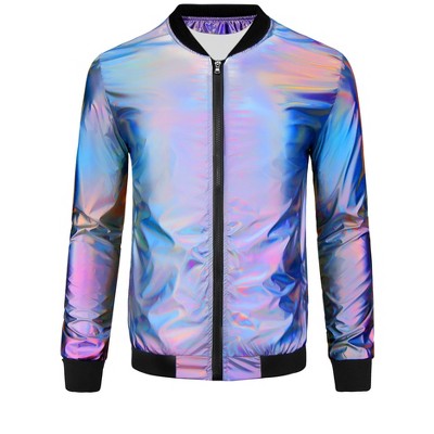 Featuring a sleek full-zip design, this metallic jacket is available in various color choices, making it versatile enough for various outfits and occasions. This shiny jacket combines a charming aesthetic with a regular fit that flatters most body types, allowing you to move freely while looking fantastic. With its holographic surface and vibrant colors, it captures the light at every angle, ensuring you become the center of attention.