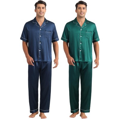 INSPIRE CHIC Men's 2 Pack Sleepwear Classic Soft Button Long Sleeve Satin Pajamas Sets 1 Dark Green 1 Navy Blue X-Large