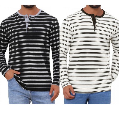 INSPIRE CHIC Men's Casual Long Sleeve Contrasting Colors Striped Henley T-Shirts 2 Packs 2 Black X-Large