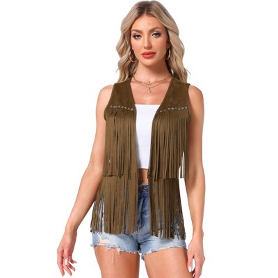Step into the spotlight with this suede fringe vest, a timeless piece inspired by western style fashion. The open front design allows for easy layering, making it a versatile addition to your wardrobe. Perfect for country concerts, themed parties, cosplay, casual outings, and western style events. Stylish tassel fringe accents add movement and a touch of retro style.