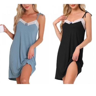 INSPIRE CHIC Women's 2 Pcs Sleepwear Summer Short Sleeves Solid with Pockets Nightgown Medium Black/Blue