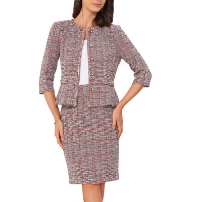 Elevate your professional style with this elegant skirt suit set, designed to keep you looking polished and confident. It features a fully lined blazer with a notched lapel collar, double-breasted front, long sleeves, and classic flap pockets, paired with a flattering midi A-line skirt for a refined silhouette. Perfectly tailored for formal settings, this suit effortlessly blends sophistication with versatility. Pair it with high heels for a chic office-ready look or dress it up for meetings, business events, parties, and daily wear. Whether you're heading to work or attending a special occasion, this skirt suit offers a stylish and practical option for the modern professional woman.