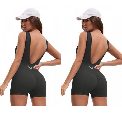 INSPIRE CHIC Women's Bodysuits Workout Jumpsuits Backless Tummy Control V Back Yoga Romper 3 Packs 2 Coffee+1 Dark Grey Large