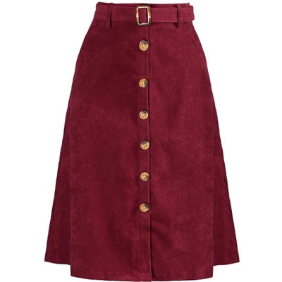 Several design points: corduroy fabric, A-Line, high waisted, elastic waist at back, slant pockets, 6 decorated buttons in the front, side zipper, midi length