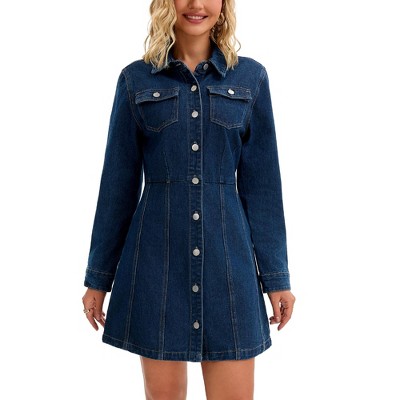 INSPIRE CHIC Women's Denim Button Up Collar Long Sleeve A-Line Above The Knee Length Jean Dresses Blue Small