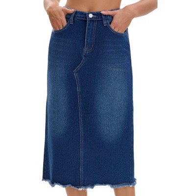 Features: Stretchy Denim Skirt, Button Zip Closure, Split Front, Front Patch Pocket, Sheath Style, Below the Knee Length, Midi Length