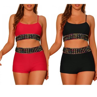 INSPIRE CHIC Women's Drawstring Push-Up Top Tropical Print High Waist Shorts Swimwear Bathing Suits 2 Sets Black, Red Small