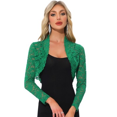 An elegant cardigan covered in a romantic floral lace panel offers a charming look for day or night. The shrug elevates with delicate floral lace decor and cropped design. It is perfectly styled with a strappy dress or simple tops. Suitable for a date, gathering, party, casual, anniversary, work, and formal occasions. Floral lace decor adds ebullient charm to this elegant knit short cardigan.