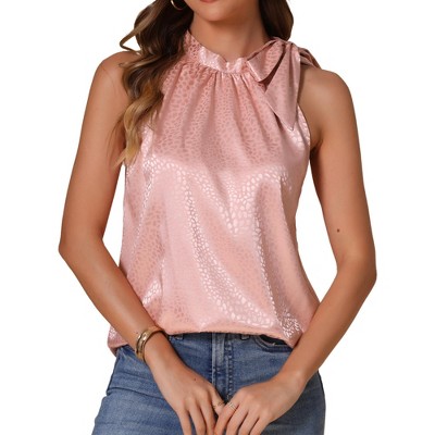 INSPIRE CHIC Women's Elegant Satin Sleeveless Bow Tie Mock Neck Solid Work Blouse