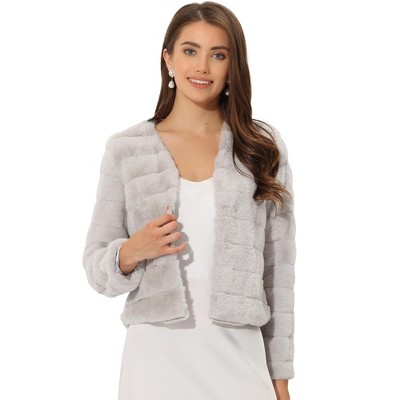 INSPIRE CHIC Women's Evening Bow Tie Front Turndown Collar Faux Fur Fluffy Cropped Coat Small Gray