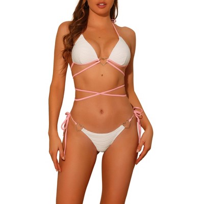 Feature: 2 pieces, solid color, self-tie, lace-up halter bikini triangle top, double straps at the back, tie closure at neck and back, removable padded cups, high cut triangle bottom