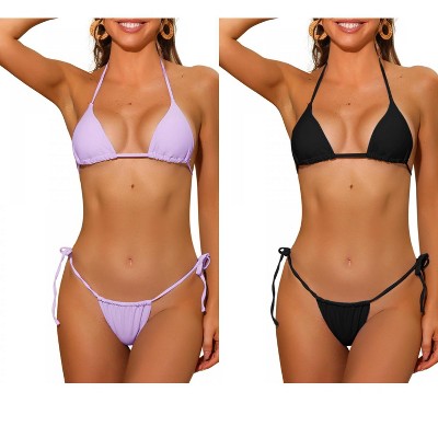Basic brief style, solid color, wire-free, self-tie, V neck, drawstring halter bikini triangle top, tie closure at neck and back, tie side low waist triangle bottom
