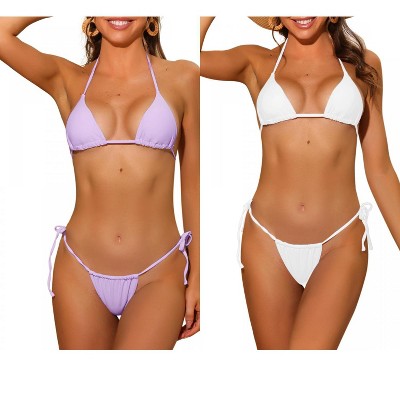 Basic brief style, solid color, wire-free, self-tie, V neck, drawstring halter bikini triangle top, tie closure at neck and back, tie side low waist triangle bottom