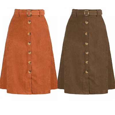 INSPIRE CHIC Women's High Waist Solid Button Front A-Line Belted Corduroy Midi Skirt 2 Packs