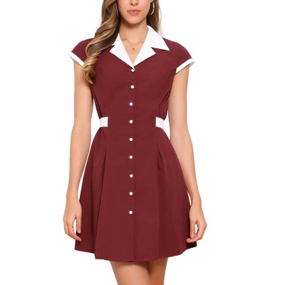 INSPIRE CHIC Women's Lapel Button Down Belted Mini Vintage Polka Dots Floral Shirt Dress X-Large Burgundy
