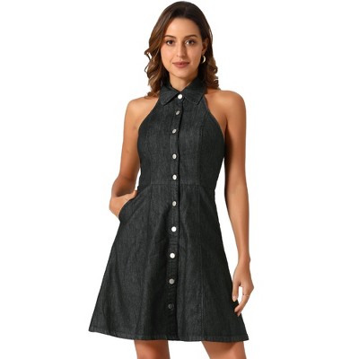 Effortlessly charming, this denim dress features a halter neck, button front, and A-line silhouette, offering a sleeveless design with a collared detail for a fresh and versatile look, ideal for casual outfits and modern wardrobes. Combine this stylish denim dress with chunky boots and a bag for a chic, season-spanning outfit. Suitable for office, workday, and casual outings, this lightweight denim dress is crafted for comfort and confidence, effortlessly transitioning from daytime meetings to evening events.