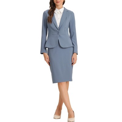 • Design details: two-piece skirt suit, lapel collar blazer, one-button blazer, two-pocket blazer, below-the-knee pencil skirt