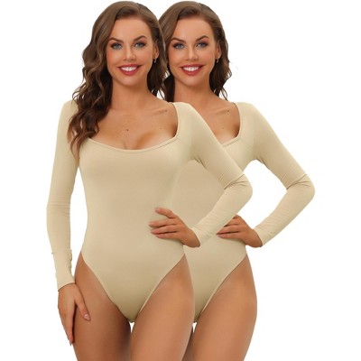 INSPIRE CHIC Women's Long Sleeve Slim Fit Stretchy Square Neck Leotard Jumpsuits 3 Packs 3 Khaki Medium