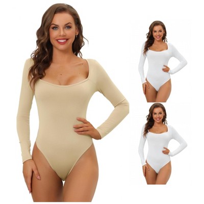 INSPIRE CHIC Women's Long Sleeve Slim Fit Stretchy Square Neck Leotard Jumpsuits 3 Packs 3 White Large
